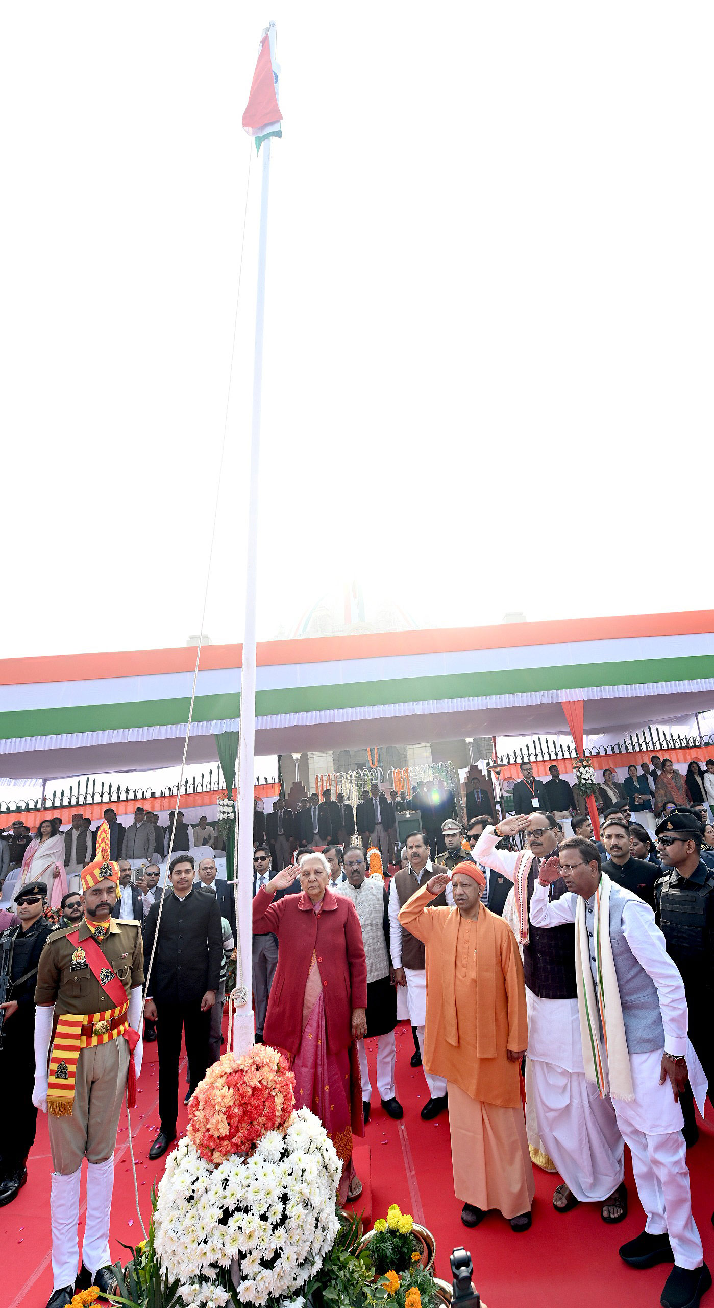 लखनऊ। राजधानी लखनऊ में 77वें गणतंत्र दिवस का मुख्य समारोह विधान भवन के सामने अत्यंत गौरव और उल्लास के साथ आयोजित किया गया, जहाँ राज्यपाल आनंदीबेन पटेल ने मुख्यमंत्री योगी आदित्यनाथ की उपस्थिति में ध्वजारोहण कर परेड की सलामी ली। समारोह की शुरुआत हेलीकॉप्टर द्वारा की गई पुष्पवर्षा और देशभक्ति के गीतों से हुई, जिसने पूरे वातावरण को राष्ट्रभक्ति के रंग में सराबोर कर दिया।