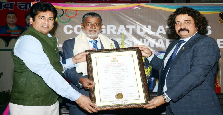 लखनऊ : खेल के पुरोधा व दिग्गज खेल प्रशासक डॉ.आनन्देश्वर पाण्डेय को कामनवेल्थ वोकेशनल यूनिवर्सिटी द्वारा फिजिकल एजुकेशन के क्षेत्र में पीएचडी की मानद उपाधि दिए जाने के चलते लखनऊ ओलंपिक एसोसिएशन के तत्वावधान में उत्तर प्रदेश के सभी खेल संघों की ओर से सम्मानित किया गया। अवध जिमखाना क्लब में आयोजित सम्मान समारोह में यश भारती पुरस्कार विजेता डॉ. आनन्देश्वर पाण्डेय (महासचिव, हैण्डबॉल फेडरेशन ऑफ इंडिया व कोषाध्यक्ष, भारतीय ओलंपिक संघ) को यह सम्मान मुख्य अतिथि डॉ.आरपी सिंह (खेल निदेशक, यूपी खेल विभाग) ने प्रदान किया। मुख्य अतिथि आरपी सिंह ने अपने संबोधन में कहा कि किसी भी विदेशी यूनिवर्सिटी से खेल के क्षेत्र में पीएचडी की मानद डिग्री पाने वाले पहले व्यक्ति बनकर डॉ.आनन्देश्वर पाण्डेय ने देश व प्रदेश का नाम रोशन किया है।