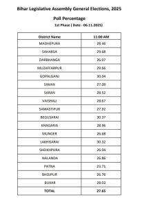 जबकि दूसरी ओर समस्तीपुर में 27.92 प्रतिशत, खगड़िया में 28.96 प्रतिशत, मुंगेर में 26.68 प्रतिशत, लखीसराय में 30.32 प्रतिशत, शेखपुरा में 26.04 प्रतिशत, नालंदा में 26.86 प्रतिशत, भोजपुर में 26.76 और बक्सर में 28.02 प्रतिशत मतदान दर्ज किया गया।