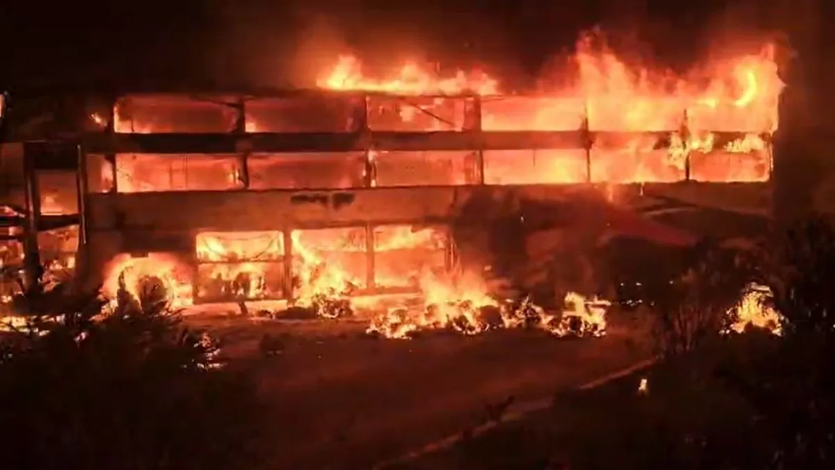 नई दिल्ली: आंध्र प्रदेश के नांदियाल जिले में एक भयानक सड़क हादसा हुआ, जिसमें एक पैसेंजर बस कंटेनर लॉरी से टकरा गई और आग पकड़ ली। इस हादसे में तीन लोगों की जलकर मौत हो गई, जबकि बस में सवार अधिकांश यात्रियों को सुरक्षित बचा लिया गया। हादसे का वीडियो सोशल मीडिया पर वायरल हो गया है, जिसमें धू-धू कर जलती हुई बस दिखाई दे रही है।
