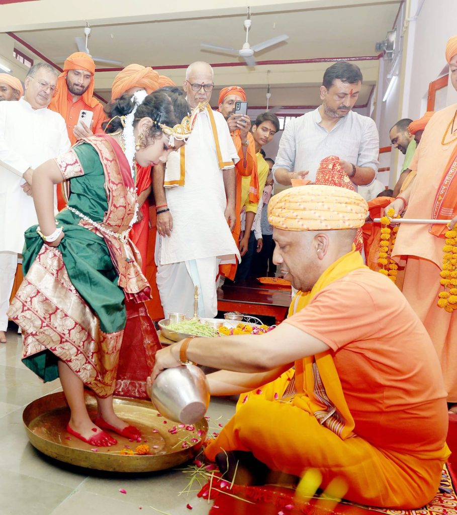 बुधवार को मुख्यमंत्री एवं गोरक्षपीठाधीश्वर योगी आदित्यनाथ ने मंदिर के अन्न क्षेत्र के प्रथम तल स्थित भोजन कक्ष में पीतल के परात में जल से नौ नन्ही बालिकाओं के बारी-बारी पांव धोये। दुर्गा सप्तशती के मंत्रोच्चार के बीच उनके माथे पर रोली, चंदन, दही, अक्षत आदि का तिलक लगाया। पुष्प और दुर्वा से उनका अभिषेक किया।