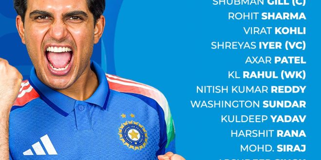 शुभमन गिल (कप्तान), रोहित शर्मा, विराट कोहली, श्रेयस अय्यर, अक्षर पटेल, केएल राहुल, नितीश कुमार रेड्डी, वॉशिंगटन सुंदर, कुलदीप यादव, हर्षित राणा, मोहम्मद सिराज, अर्शदीप सिंह, प्रसिद्ध कृष्णा, ध्रुव जुरेल , यशस्वी जायसवाल।