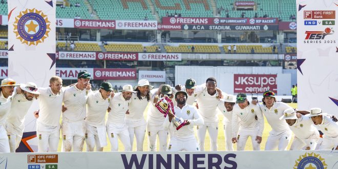 भारत और दक्षिण अफ्रीका के बीच दूसरे टेस्ट क्रिकेट मैच के पाँचवें दिन का खेल खत्म होने पर ट्रॉफी के साथ जश्न मनाते दक्षिण अफ्रीकी खिलाड़ी।