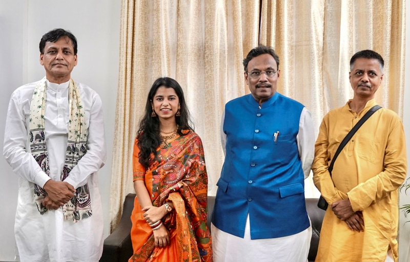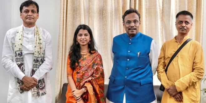 5 अक्टूबर, 2025 को पोस्ट की गई इस तस्वीर में केंद्रीय गृह राज्य मंत्री नित्यानंद राय, भारतीय जनता पार्टी के नेता विनोद तावड़े, गायिका मैथिली ठाकुर ।