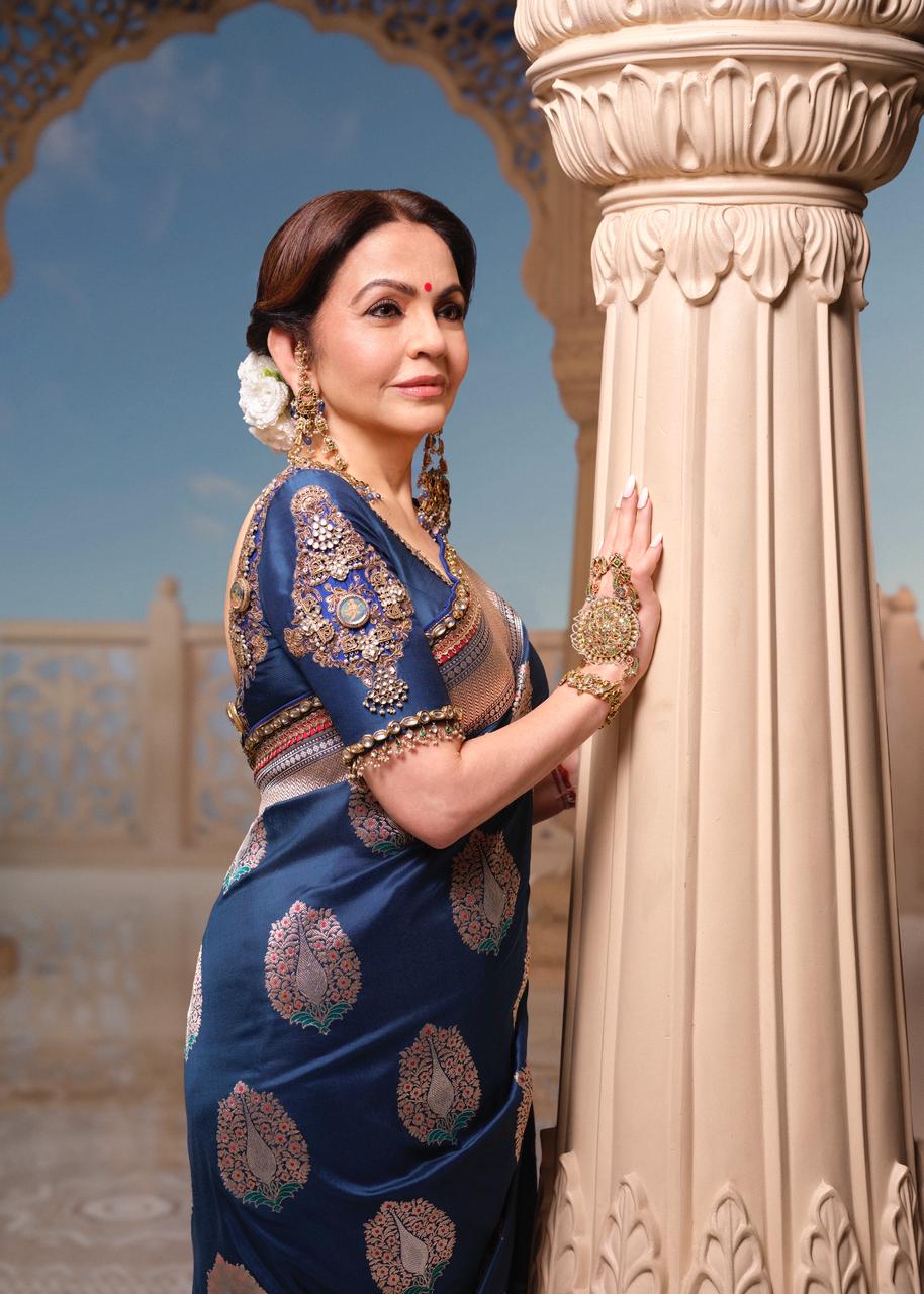 श्रीमती नीता अंबानी ने भारत के कलाकारों और कारीगरों के सम्मान में मुंबई स्थित ईरोस के स्वदेश फ्लैगशिप स्टोर पर एक खास समारोह आयोजित किया। इस अवसर पर उन्होंने स्वदेश की पीकॉक ब्लू (मोर-नीले) रंग की बनारसी साड़ी पहनी, जिस पर बारीक मीना कारीगरी और पारंपरिक कढ़ुआ बुनाई की गई थी।