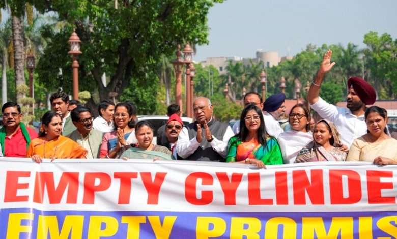 नई दिल्ली। देश में एलपीजी संकट के मुद्दे को लेकर विपक्षी दलों के सांसदों ने बुधवार को संसद परिसर में जोरदार प्रदर्शन किया। प्रदर्शन में मल्लिकार्जुन खरगे, सुप्रिया सुले और धर्मेन्द्र यादव सहित कई विपक्षी सांसद शामिल हुए। सांसदों ने हाथों में एक बड़ा बैनर ले रखा था, जिस पर “एम्प्टी सिलेंडर, एम्प्टी प्रॉमिसेस” (खाली सिलेंडर, खोखले वादे) लिखा हुआ था।