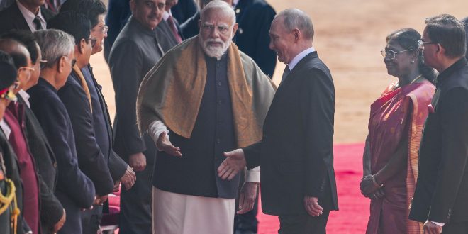 नयी दिल्ली।  रूस के राष्ट्रपति व्लादिमीर पुतिन का शुक्रवार को प्रधानमंत्री नरेन्द्र मोदी के साथ होने वाली शिखर वार्ता से पहले राष्ट्रपति भवन के प्रांगण में औपचारिक स्वागत किया गया। प्रधानमंत्री मोदी ने बृहस्पतिवार को नयी दिल्ली के पालम हवाईअड्डे पर गले लगाकर पुतिन का स्वागत किया था।