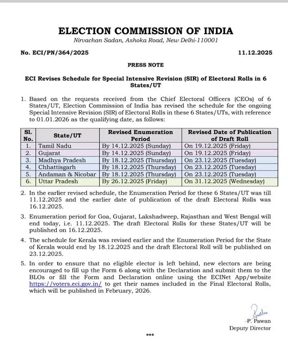 नई समय-सारिणी के अनुसार तमिलनाडु और गुजरात में मतदाता सूची के लिए एन्यूमरेशन 14 दिसंबर 2025 तक चलेगा, जबकि ड्राफ्ट इलेक्टोरल रोल 19 दिसंबर को जारी किया जाएगा। मध्य प्रदेश, छत्तीसगढ़ और अंडमान-निकोबार में यह प्रक्रिया 18 दिसंबर तक जारी रहेगी और ड्राफ्ट सूची 23 दिसंबर को प्रकाशित होगी।