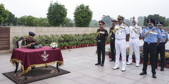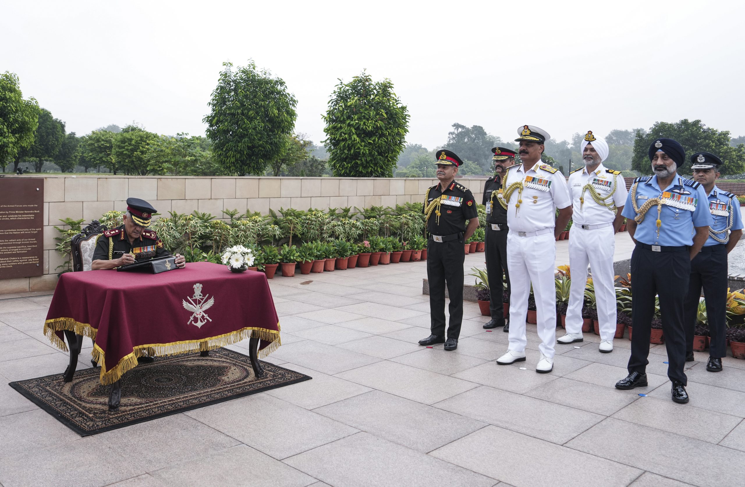 चीफ ऑफ डिफेंस स्टाफ (सीडीएस) जनरल अनिल चौहान बुधवार, 8 अक्टूबर, 2025 को नई दिल्ली में 93वें भारतीय वायु सेना दिवस पर श्रद्धांजलि अर्पित करने के बाद राष्ट्रीय युद्ध स्मारक पर आगंतुक पुस्तिका पर हस्ताक्षर करते हुए।